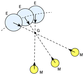 ここで、Gha万有引力定数、Mは天体の質量、Eは地球の質量、dは月の重心から地球の重心までの距離である。
