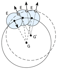 ここで、地球の表面上にある質点の動きを考えてみると、この質点の軌跡は、地球の重心と平行に同じ半径の円を描く。(図2)